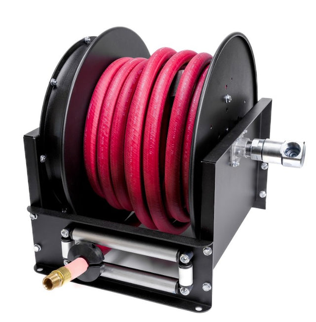 D-Series reels are a rugged design for handling longer hose lengths up to 100' and ID from 3/8" to 1". Used for a wide variety of applications including air, water, oil, diesel fuel, used fluid evacuation, and applications where either long hose length or high flow rates are needed.