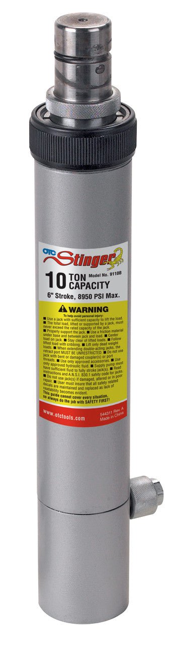 This premium quality ram is designed for long, trouble-free service. Backed by a two-year warranty, it features a special piston rod that permits its use with the snap-together components of OTC Stinger's new collision repair sets, or with most similar competitive products. 10-ton ram with 6" stroke, 15" min. height, 21" max. height, spring return, 1.310" rod end dia., 8,950 max. operating pressure, 13.69 oil cap. (cu. in.), 1/4" NPT oil port.
