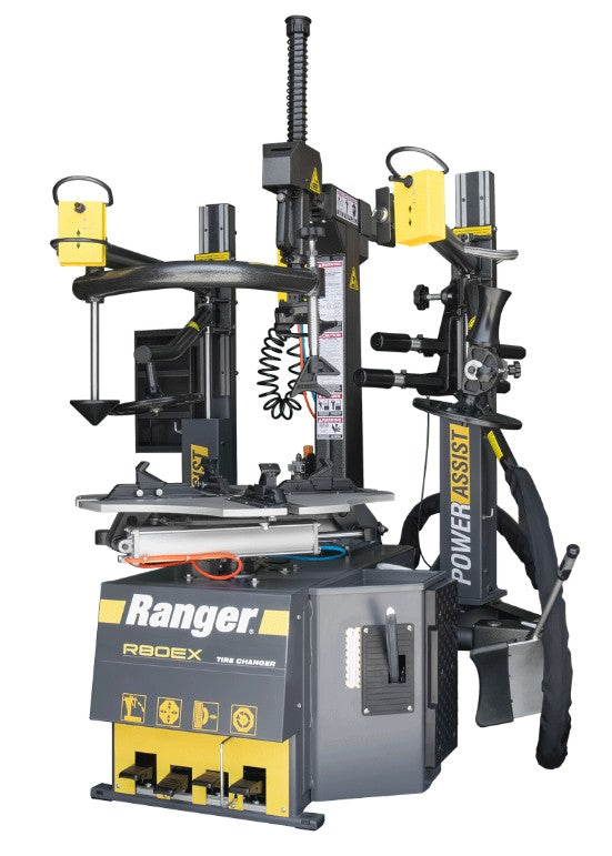 Ranger's Updated and Incredibly Advanced Tire Changer Looking to save time? An R80EX tire changer is a must-have machine for busy shops that don't have a minute to waste. A multi-profile traveling drop-center tool, top bead assist rollers, dual lower bead lifting discs and a nylon non-marring wheel restraint device are important tire shop tools designed to dramatically reduce effort, increase safety and help minimize operator fatigue. A large 34” capacity turntable with adjustable hardened-steel RimGuard wheel clamps helps broaden the service range, so you can handle virtually any wheel that rolls in your shop. Explore this tire machine if your shop life demands a tool that will generously handle round-the-clock use and abuse. Adjustable RimGuard wheel clamps Ranger's trademark wheel clamps feature internal and external multi-teeth jaws. Advanced clamp positioning Variable clamp positioning makes wheel service simple, perfectly controlling the wheels when clamping them. Operators have the freedom to freely and precisely position clamps within the entire clamping range. There's no need for the clamps to cycle the full range. Easier bead lubrication A geometric tabletop provides for easier bead lubrication and allows operators to make visual inspections of the lower bead during mounting and inflation procedures. Power-controlled bead loosener A bilateral, power-controlled bead loosener features single-lever control on the shovel handle. This ergonomic design eliminates traditional foot-pedal controls that often force technicians into unbalanced working stances when loosening beads. Designed for maximum comfort, efficiency, safety and ease of use, this valuable feature helps deliver additional power, speed and control, especially when servicing large or wide assemblies.