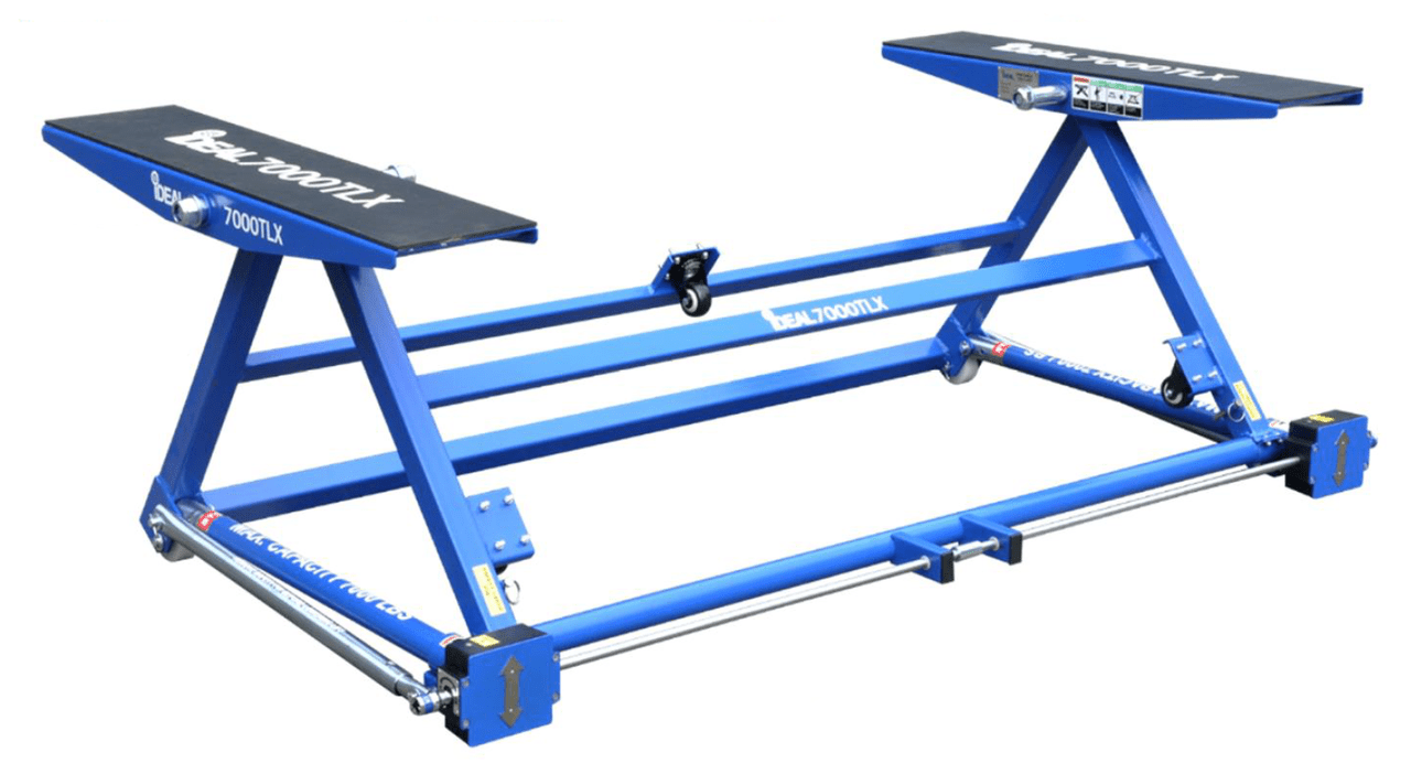 The iDEAL 7000TLX is one of the most economical, unique, versatile & convenient vehicle lifting solutions in the market today. The iDEAL 7000TLX is a low-profile, lightweight, portable 7,000 lb. capacity low-rise scissor frame contact tilt lift designed for unibody type passenger & small sport utility vehicles. Equipped with twin dual-action precision gear drive mechanisms, the lifting operation is simply powered by the torque supplied from an electric handheld drill. Additionally, the ‘exclusive’ dual independent safety lock bars also allow for full operation from either side of the lift. The unique vehicle ‘lift & tilt’ operation provides greater overall accessibility to vehicle, while also being able to quickly & conveniently be stored out of the way. Designed for multi-use applications, the iDEAL 7000TLX can be widely used in residential garages, auto service shops, autobody repair centers, car dealers or for detailing.