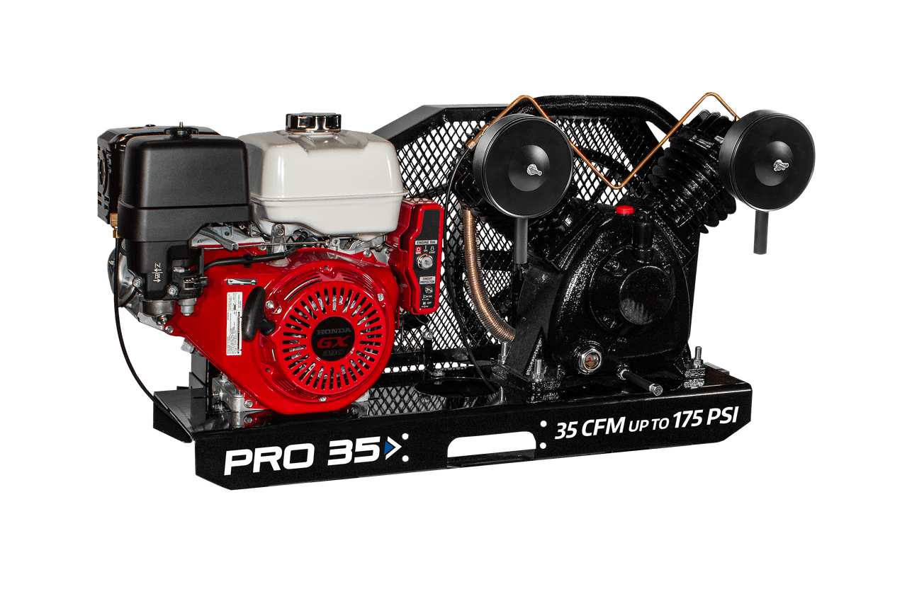 Vanair’s line of entry level reciprocating compressor packages were developed to meet the demands of customers that need the convenience of mobile air at an economical cost. Designed to provide rugged, powerful, and dependable performance, these compressors are a perfect fit for the mechanic, service, agriculture, and contractor markets. The Vanair PRO Series offers Honda or Kohler engines and air power from 18 or 35 CFM with up to 175 PSI. Systems are all electric start and are available in a skid, 10-gallon twin and 30-gallon tank configuration.